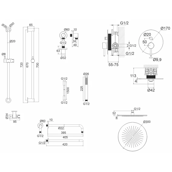 Душевой шланг, Душевая лейка, Держатель для душевой лейки, Подключение для душевого шланга, Верхний душ, Скрытая монтажная часть, Смеситель, Кронштейн, Штанга душевая