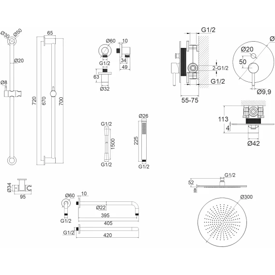 Душевой шланг, Душевая лейка, Держатель для душевой лейки, Подключение для душевого шланга, Верхний душ, Скрытая монтажная часть, Смеситель, Кронштейн, Штанга душевая