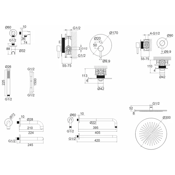 Аэратор, Душевой шланг, Душевая лейка, Подключение для душевого шланга с держателем, Верхний душ, Излив, Скрытая монтажная часть, Смеситель, Кронштейн