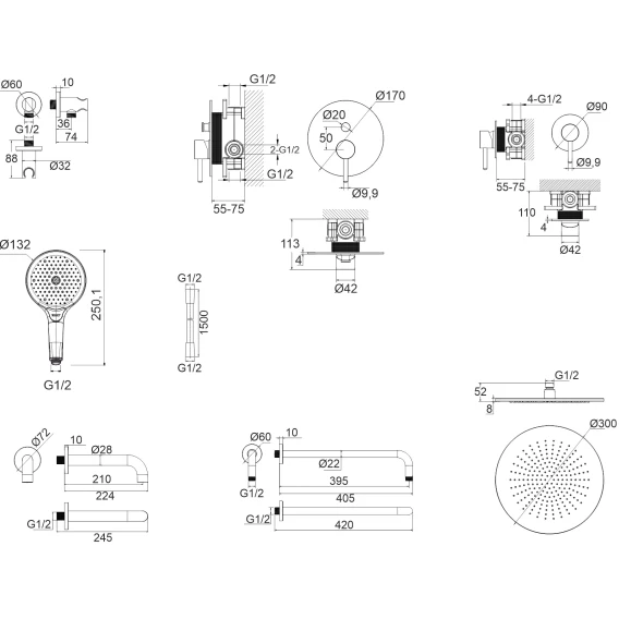 Аэратор, Душевой шланг, Душевая лейка, Подключение для душевого шланга с держателем, Верхний душ, Излив, Скрытая монтажная часть, Смеситель, Кронштейн
