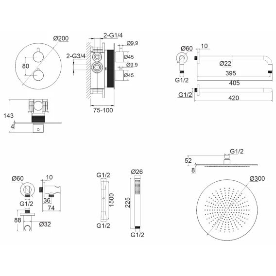 Душевой шланг, Душевая лейка, Подключение для душевого шланга с держателем, Верхний душ, Скрытая монтажная часть, Кронштейн, Термостат