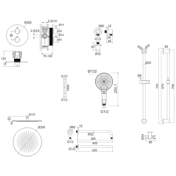 Душевой шланг, Душевая лейка, Держатель для душевой лейки, Подключение для душевого шланга, Верхний душ, Скрытая монтажная часть, Кронштейн, Штанга душевая, Термостат