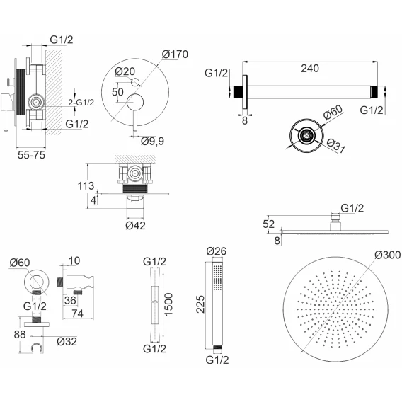 Душевой шланг, Душевая лейка, Подключение для душевого шланга с держателем, Верхний душ, Скрытая монтажная часть, Смеситель, Кронштейн
