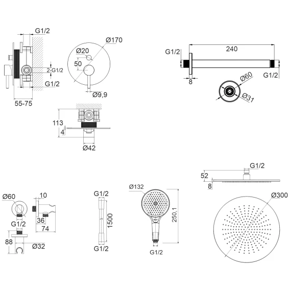 Душевой шланг, Душевая лейка, Подключение для душевого шланга с держателем, Верхний душ, Скрытая монтажная часть, Смеситель, Кронштейн