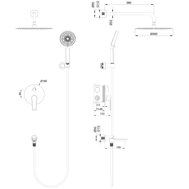 Аэратор, Душевой шланг, Душевая лейка, Держатель для душевой лейки, Подключение для душевого шланга, Верхний душ, Излив, Скрытая монтажная часть, Смеситель, Кронштейн