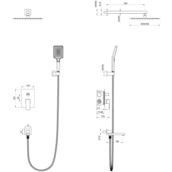 Аэратор, Душевой шланг, Душевая лейка, Держатель для душевой лейки, Подключение для душевого шланга, Верхний душ, Излив, Скрытая монтажная часть, Смеситель, Кронштейн