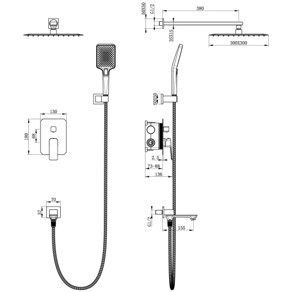 Аэратор, Душевой шланг, Душевая лейка, Держатель для душевой лейки, Подключение для душевого шланга, Верхний душ, Излив, Скрытая монтажная часть, Смеситель, Кронштейн