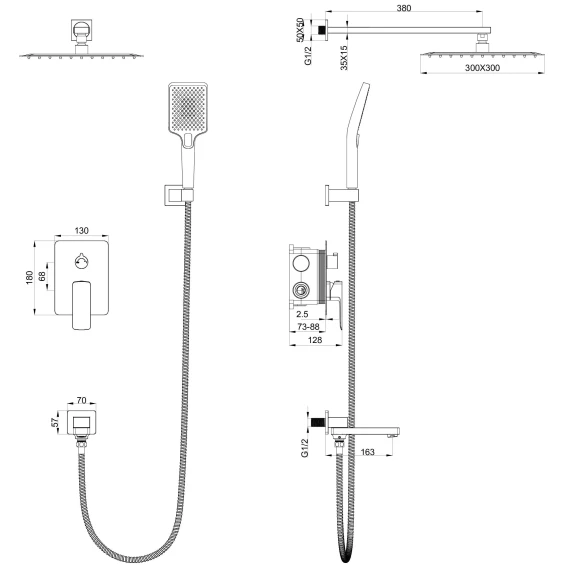 Душевой комплект Wonzon & Woghand Edge WW-88939003-MB 300 мм, со смесителем, черный матовый