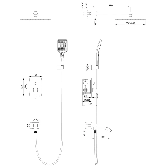 Аэратор, Душевой шланг, Душевая лейка, Держатель для душевой лейки, Подключение для душевого шланга, Верхний душ, Излив, Скрытая монтажная часть, Смеситель, Кронштейн