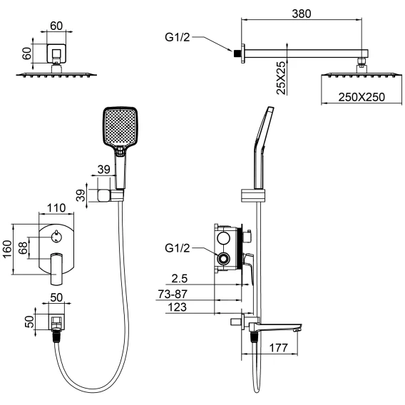 Аэратор, Душевой шланг, Душевая лейка, Держатель для душевой лейки, Подключение для душевого шланга, Верхний душ, Излив, Скрытая монтажная часть, Смеситель, Кронштейн