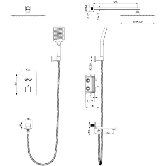 Аэратор, Душевой шланг, Душевая лейка, Держатель для душевой лейки, Подключение для душевого шланга, Верхний душ, Излив, Скрытая монтажная часть, Кронштейн, Термостат