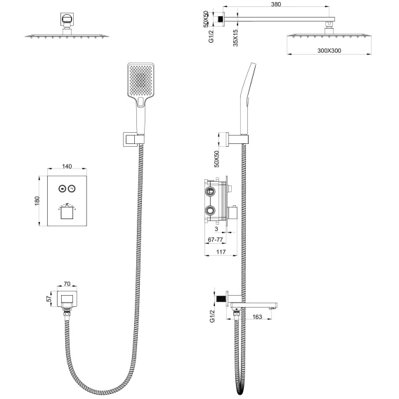 Аэратор, Душевой шланг, Душевая лейка, Держатель для душевой лейки, Подключение для душевого шланга, Верхний душ, Излив, Скрытая монтажная часть, Кронштейн, Термостат