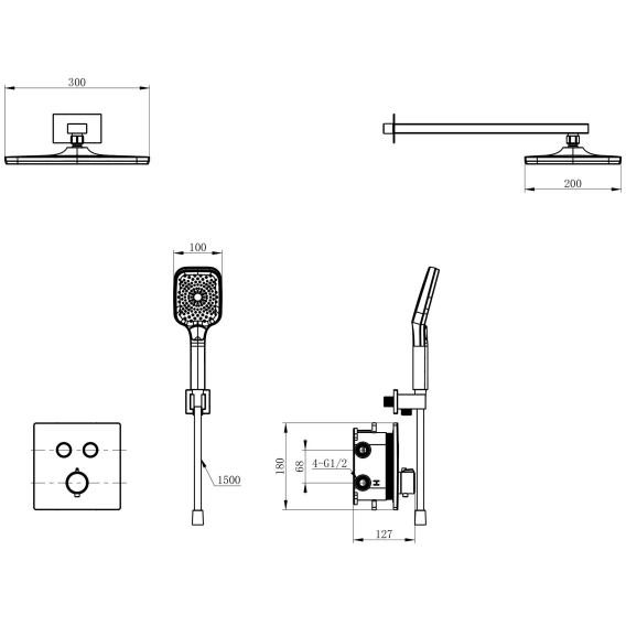 Душевой шланг, Душевая лейка, Подключение для душевого шланга с держателем, Верхний душ, Скрытая монтажная часть, Кронштейн, Термостат