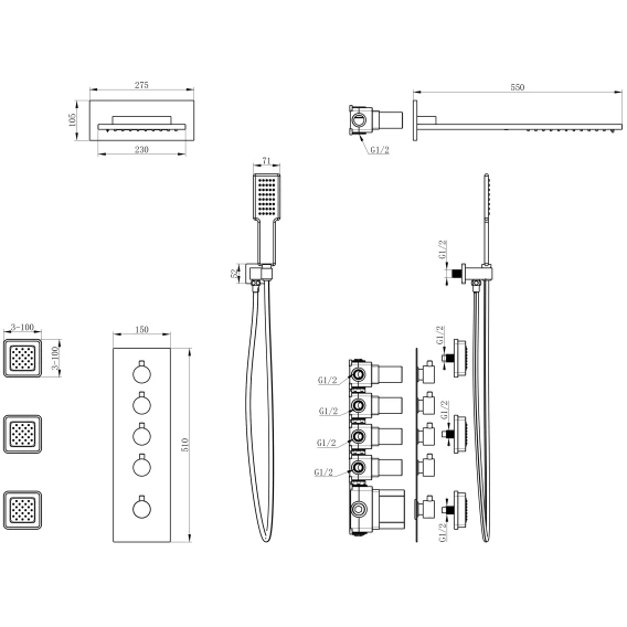 Душевой шланг, Душевая лейка, Подключение для душевого шланга с держателем, Верхний душ, Скрытая монтажная часть, Кронштейн, Термостат, Душевая форсунка