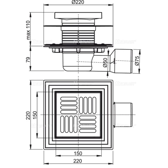 •  Корпус сливного трапа с боковым подключением к стоку Ø50 / 75 мм