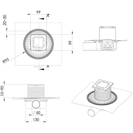 • Сифон PP с гидроизоляцией: горизонтальный выпуск D50 H65, монтаж 360°
