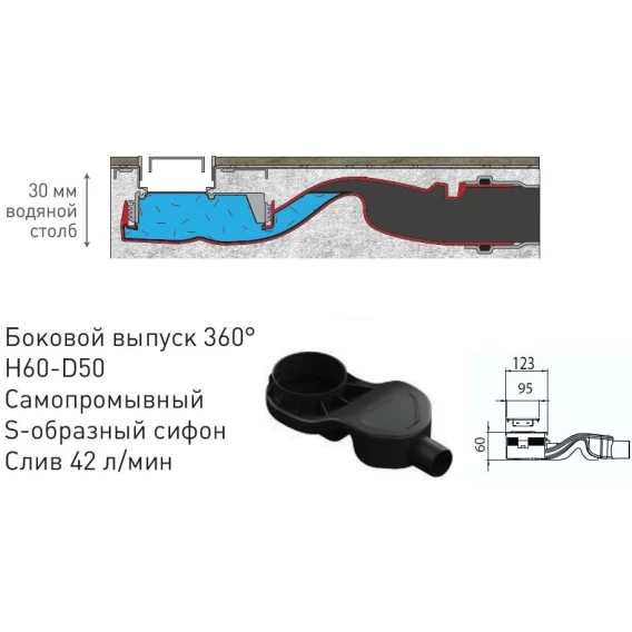 • Самопромывной S-образный сифон PP: горизонтальный выпуск D50 H60, пропускная способность 42 л /мин, монтаж 360°