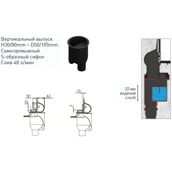 • Самопромывной S-образный сифон с переходником PP: вертикальный выпуск, пропускная способность 48 л/мин, монтаж 360°