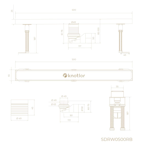 Душевой трап (лоток) Knotlor Terra SDRW0500RB 50 см, с решеткой, 2 в 1 под плитку, бронза матовая