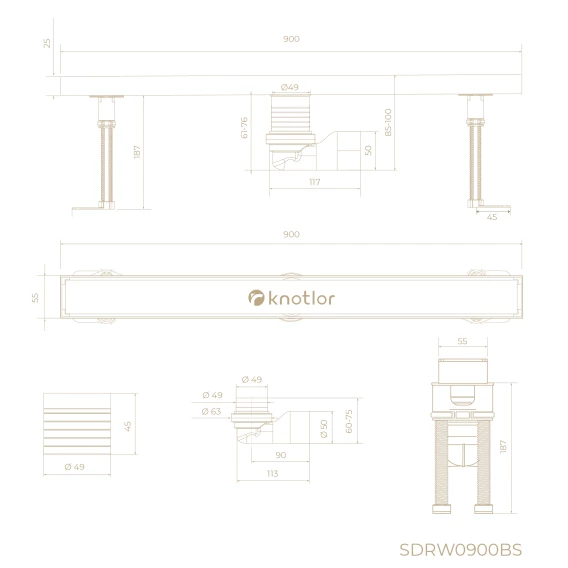 Душевой трап (лоток) Knotlor Terra SDRW0900BS 90 см, с решеткой, 2 в 1 под плитку, нержавеющая сталь