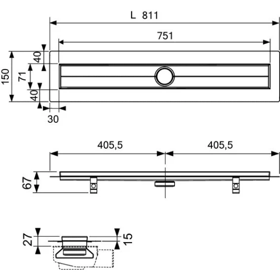 • Установочная высота от низа сифона до верхней плоскости душевого канала = 95 мм