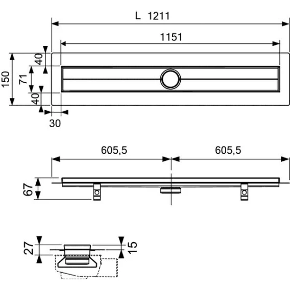 • Установочная высота от низа сифона до верхней плоскости душевого канала = 95 мм