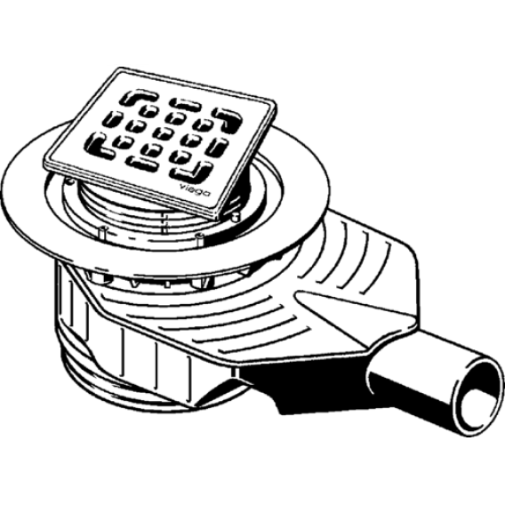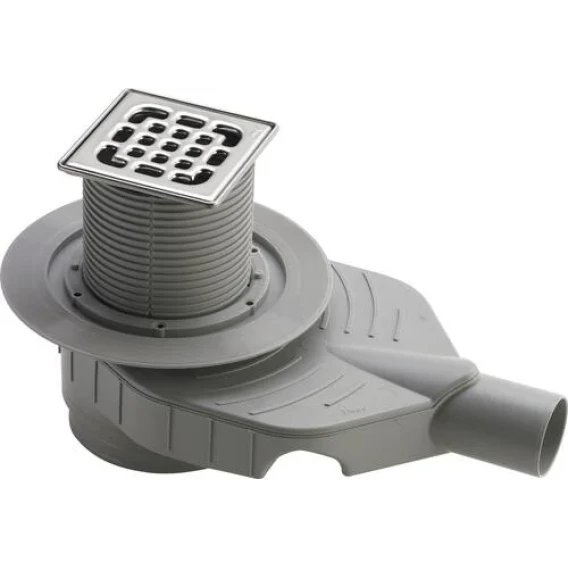 гидрозатвор устойчив к обратному потоку и регулируется в диапазоне 35–50 мм, возможность очистки соединительной линии, верхняя часть 100x100 мм вращается и регулируется по высоте, решетка из нержавеющей стали 1.4301, заглушка, уплотнительный фланец, съемный сифон