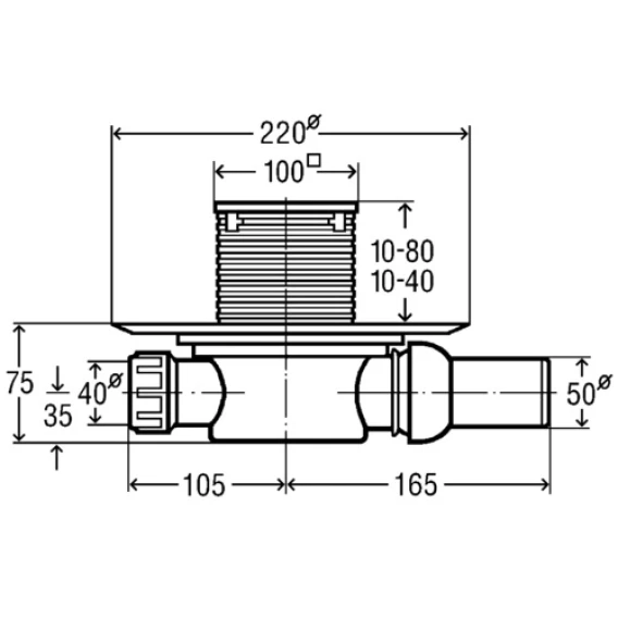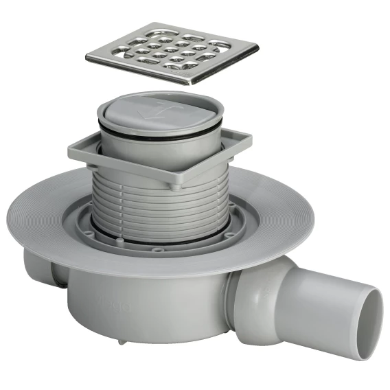 • поворотная и регулируемая по высоте насадка 100x100 мм, заглушка, штампованная решетка из нержавеющей стали 1.4301, фланец для нанесения/закрепления гидроизоляции, съемное устройство для защиты от неприятного запаха из системы канализации, ввод для подключения дополнительных сантехприборов DN40, выпуск на шарнирном соединении