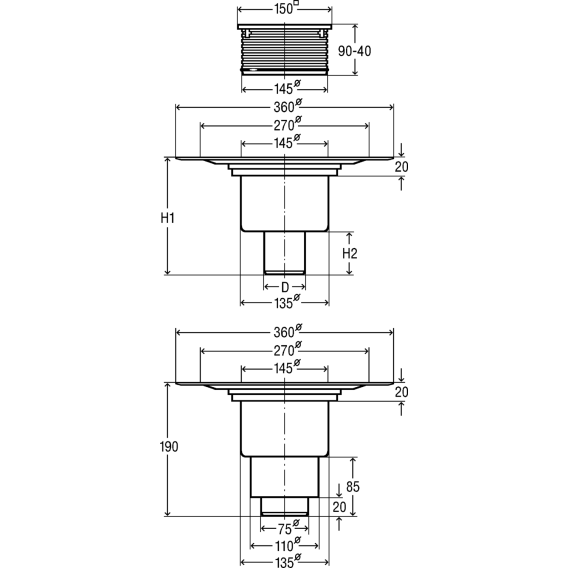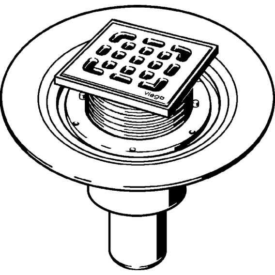 уплотнительный фланец, верхняя часть 150x150 мм поворотная и регулируемая по высоте, заглушка, пластиковая рама, решетка из нержавеющей стали 1.4301, съемный сифон