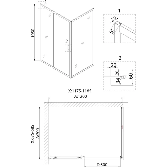 Душевой уголок 118,5x68,5 см Niagara NG-82-12AB-A70B прозрачное