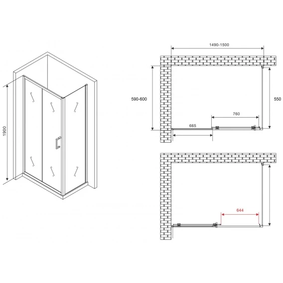 Душевой уголок 150x60 см Abber Schwarzer Diamant AG30150BH-S60B-S60B прозрачное