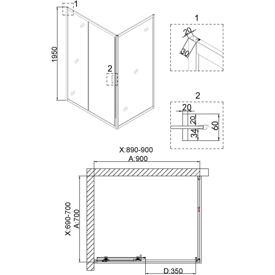 Душевой уголок 90x70 см Niagara NG-42-9AG-A70G прозрачное