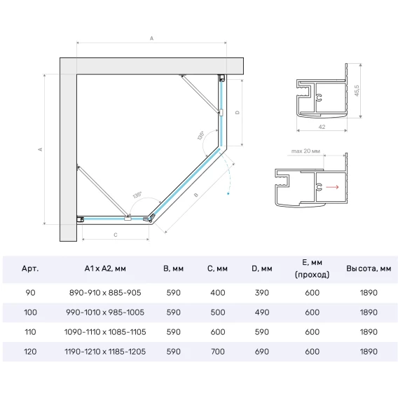 Душевой уголок Vegas Glass AFA-Pen NOVO 120 01 01 R 120x120 см R, профиль белый, стекло прозрачное