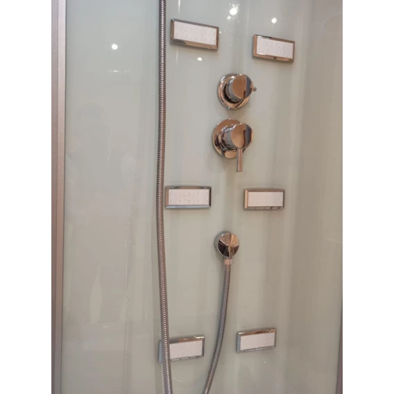 Душевой шланг, Душевая лейка, Держатель для душевой лейки, Подключение для душевого шланга, Полочка, Ручки, Подсветка, Верхний душ, Металлический каркас, Поддон, Радио, Слив-перелив, Ножки