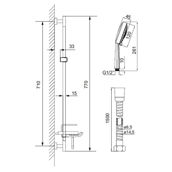Душевая лейка, Держатель для душевой лейки, Полочка, Полотенцедержатель, Штанга душевая