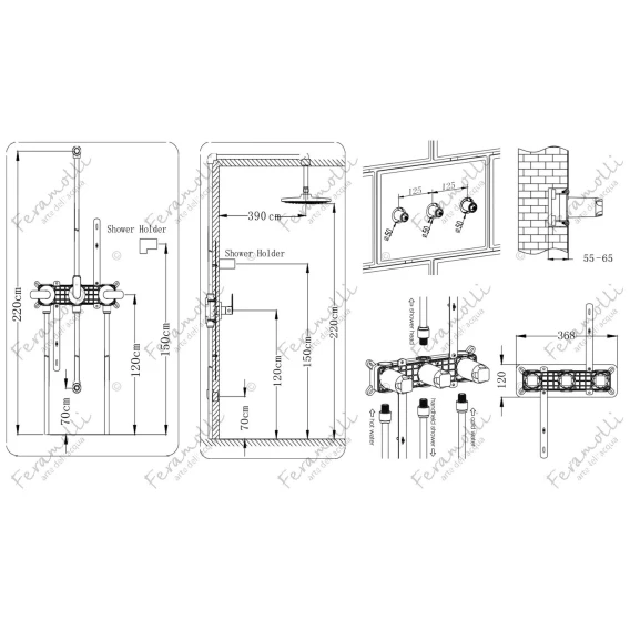 Душевой шланг, Душевая лейка, Держатель для душевой лейки, Подключение для душевого шланга, Верхний душ, Скрытая монтажная часть, Смеситель, Кронштейн