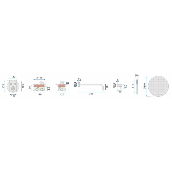 Душевой шланг, Душевая лейка, Подключение для душевого шланга с держателем, Верхний душ, Скрытая монтажная часть, Кронштейн, Термостат