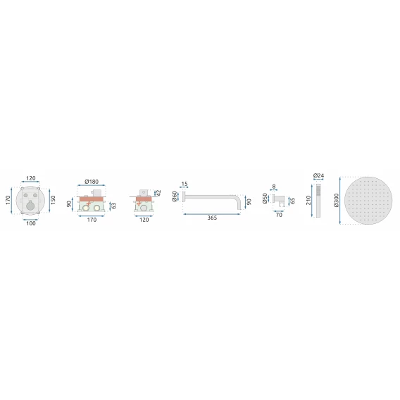 Душевой шланг, Душевая лейка, Подключение для душевого шланга с держателем, Верхний душ, Скрытая монтажная часть, Кронштейн, Термостат