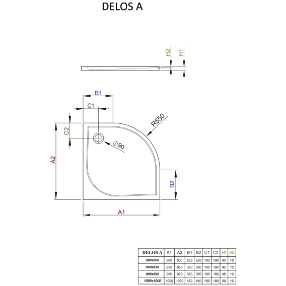 • Плоский полукруглый акриловый поддон — радиус r=550мм.