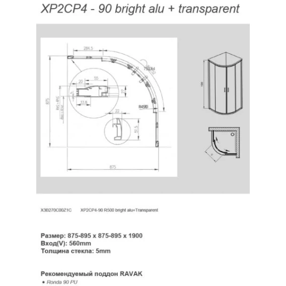 • Душевой уголок Ravak Blix XP2CP4 - 90 блестящий Transparent X3B270C00Z1C