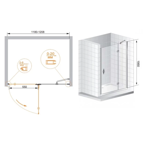 • Тип дверей: одна распашная дверь с одним неподвижным стеклом