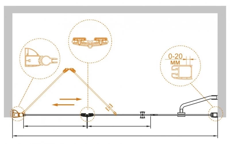 • Тип дверей: складная двухсекционная и одна неподвижная часть
