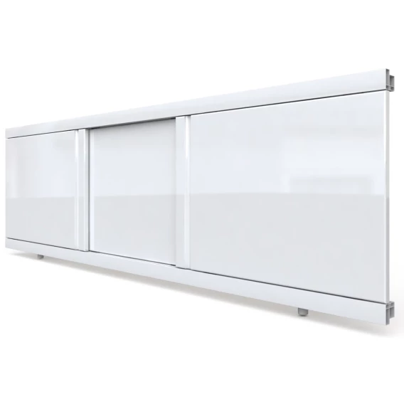 Каркас экрана выполнен из алюминиевого профиля, дверки изготовлены из МДФ и покрыты ПВХ пленкой толщиной 0,45 мм. Экран имеет 3 раздвижных створки с фрезированными ручками. Алюминиевый профиль окрашен порошковой краской белого цвета. Высота экрана 500 мм+ножки 20 мм. Ножки регулируются на 100 мм. Вертикальные стойки смещены к центру, что позволяет при необходимости его подрезать.