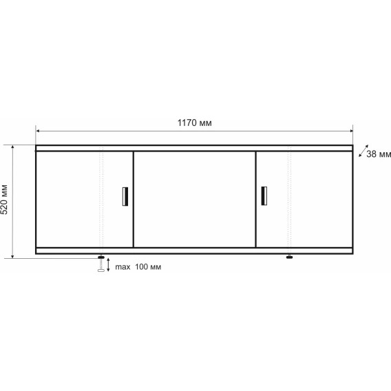 Каркас экрана выполнен из алюминиевого профиля, дверки изготовлены из МДФ и покрыты ПВХ пленкой толщиной 0,45 мм. Экран имеет 3 раздвижных створки. Алюминиевый профиль окрашен порошковой краской белого цвета. Высота экрана 500 мм+ножки 20 мм. Ножки регулируются на 100 мм. Вертикальные стойки смещены к центру, что позволяет при необходимости его подрезать.