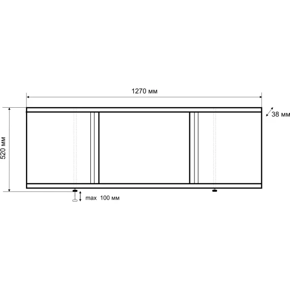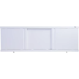 Каркас экрана выполнен из алюминиевого профиля, дверки изготовлены из МДФ и покрыты ПВХ пленкой толщиной 0,45 мм. Экран имеет 3 раздвижных створки с фрезированными ручками. Алюминиевый профиль окрашен порошковой краской белого цвета. Высота экрана 500 мм+ножки 20 мм. Ножки регулируются на 100 мм. Вертикальные стойки смещены к центру, что позволяет при необходимости его подрезать.