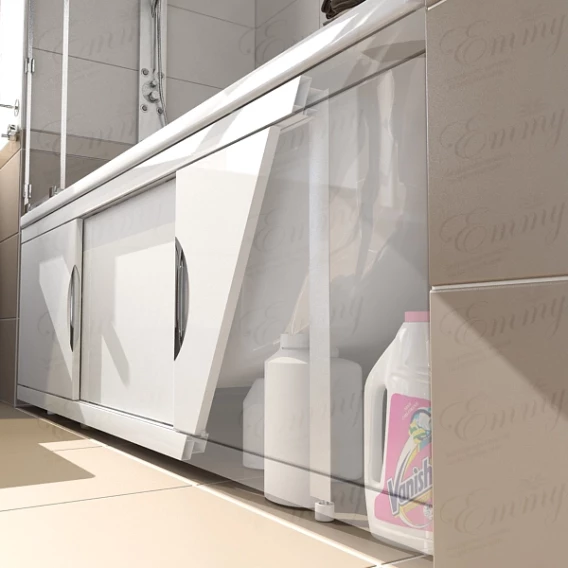 Каркас экрана выполнен из алюминиевого профиля, дверки изготовлены из МДФ и покрыты ПВХ пленкой толщиной 0,45 мм. Экран имеет 3 раздвижных створки. Алюминиевый профиль окрашен порошковой краской белого цвета. Высота экрана 500 мм+ножки 20 мм. Ножки регулируются на 100 мм. Вертикальные стойки смещены к центру, что позволяет при необходимости его подрезать.