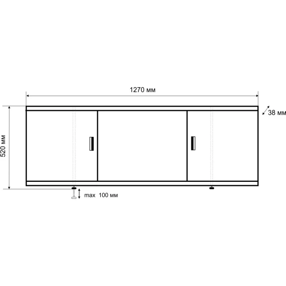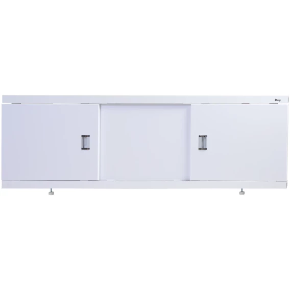 Каркас экрана выполнен из алюминиевого профиля, дверки изготовлены из МДФ и покрыты ПВХ пленкой толщиной 0,45 мм. Экран имеет 3 раздвижных створки. Алюминиевый профиль окрашен порошковой краской белого цвета. Высота экрана 500 мм+ножки 20 мм. Ножки регулируются на 100 мм. Вертикальные стойки смещены к центру, что позволяет при необходимости его подрезать.