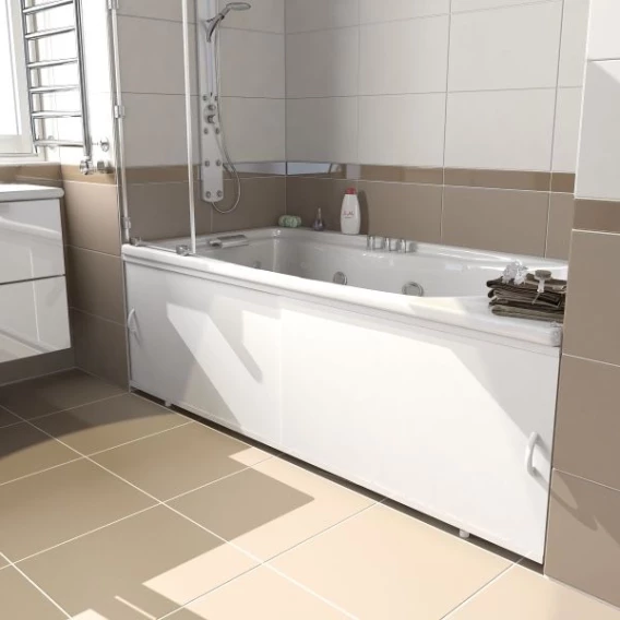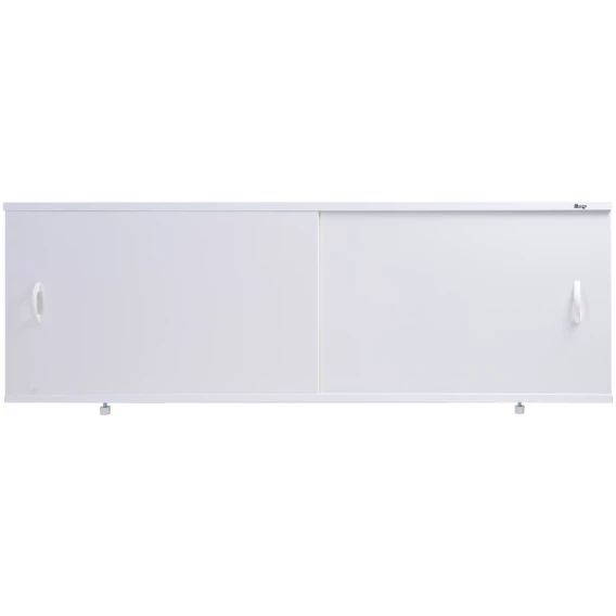 Каркас экрана выполнен из алюминиевого профиля, дверки изготовлены из ПВХ панелей толщиной 0,4 см. Экран имеет 2 раздвижные створки. На пластиковых дверях имеется защитная пленка, которую необходимо удалить после установки экрана. Алюминиевый профиль окрашен порошковой краской белого цвета. Высота экрана 500 мм+ножки 20 мм. Ножки регулируются на 100 мм.