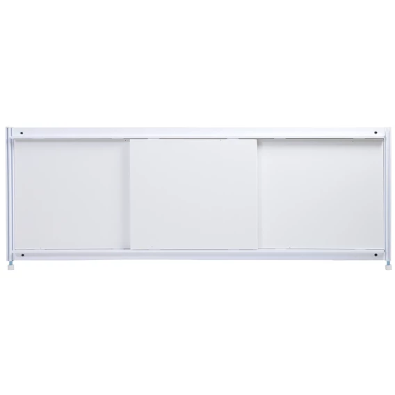 Каркас экрана выполнен из алюминиевого профиля, дверки изготовлены из МДФ и покрыты ПВХ пленкой толщиной 0,45 мм. Экран имеет 3 раздвижных створки. Алюминиевый профиль окрашен порошковой краской белого цвета и собирается на замках, что позволяет дополнительно регулировать экран по высоте. К боковым стойкам возможен монтаж торцевых панелей. Высота экрана 500 мм+ножки 20 мм. Ножки регулируются на 100 мм.