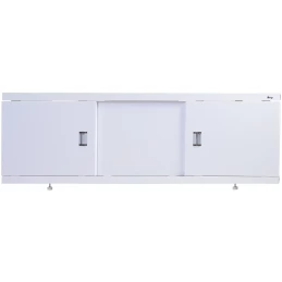 Каркас экрана выполнен из алюминиевого профиля, дверки изготовлены из МДФ и покрыты ПВХ пленкой толщиной 0,45 мм. Экран имеет 3 раздвижных створки. Алюминиевый профиль окрашен порошковой краской белого цвета. Высота экрана 500 мм+ножки 20 мм. Ножки регулируются на 100 мм. Вертикальные стойки смещены к центру, что позволяет при необходимости его подрезать.